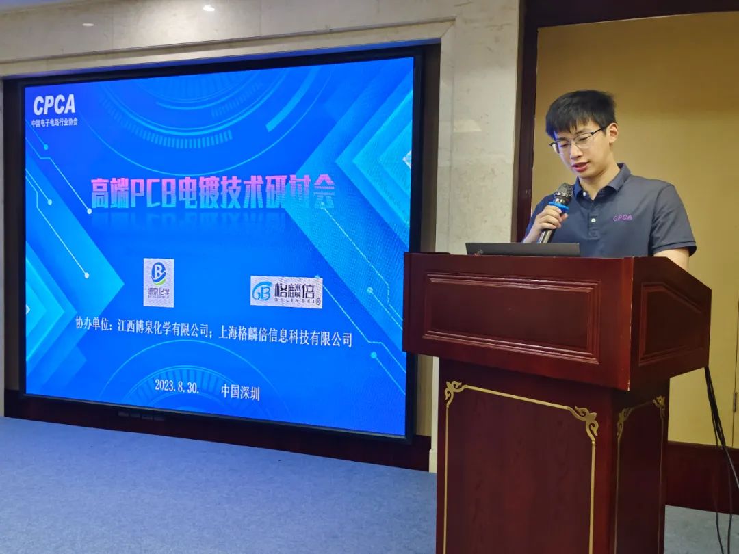 随着当下人工智能(AI)行业高速发展,令应用在AI服务器上的高价值量PCB产品市场需求大幅提升。AI服务器芯片升级,PCB也需相应地进行升级,不仅层数提升,而且板厚更厚,表面线路布局更密,对于PCB电镀提出更高技术要求。基于此背景下,2023年8月30日,由betway手机版登录 CPCA主办,江西博泉化学有限公司与上海格麟倍信息科技有限公司协办的“高端PCB电镀技术研讨会”在广东省深圳市宝安区皇家维纳斯酒店维也纳厅召开。